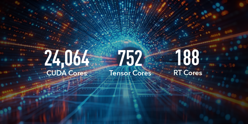 - 搭载 PCIe x16 介面,提供 24,064 CUDA 核心、752 Tensor 核心和 188 RT 核心